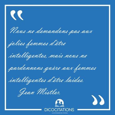 ![Nous ne demandons pas aux jolies femmes d'être intelligentes, [...] - Jean Mistler... Nous ne demandons pas aux jolies femmes d'être intelligentes, [...] - Jean Mistler...](/imagescitations/Nous_ne_demandons_pas_aux_jolies_femmes_d_etre_intelligentes_-_Jean_Mistler-174593.jpg)