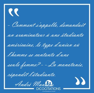 - Comment s'appelle, demandait un examinateur à une étudiante américaine, le type d'union où l'homme se contente d'une seule femme? - - La monotonie, répondit l'étudiante.