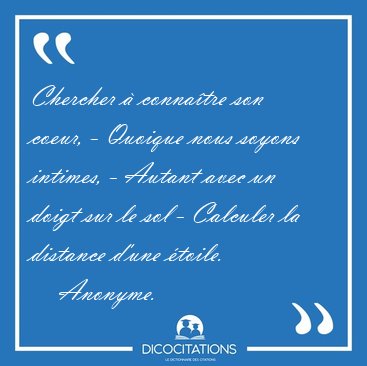 Chercher à connaître son coeur, - Quoique nous soyons intimes, - Autant avec un doigt sur le sol - Calculer la distance d'une étoile.