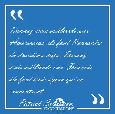 ![Donnez trois milliards aux Américains, ils font Rencontre du [...] - Patrick Sébastien... Donnez trois milliards aux Américains, ils font Rencontre du [...] - Patrick Sébastien...](/imagescitations/Donnez_trois_milliards_aux_Americains_ils_font_Rencontre_du_-_Patrick_Sebastien-31115.jpg)
