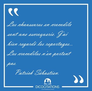 ![Les chaussures en crocodile sont une escroquerie. J'ai bien [...] - Patrick Sébastien... Les chaussures en crocodile sont une escroquerie. J'ai bien [...] - Patrick Sébastien...](/imagescitations/Les_chaussures_en_crocodile_sont_une_escroquerie_J_ai_bien_-_Patrick_Sebastien-31225.jpg)