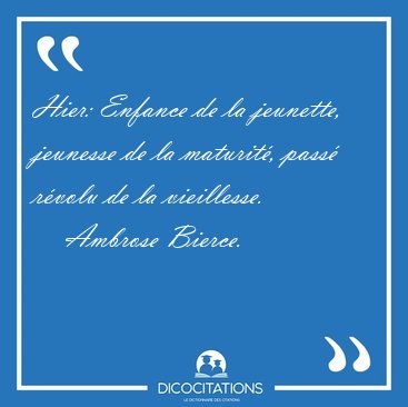 ![Hier: Enfance de la jeunette, jeunesse de la maturité, passé [...] - Ambrose Bierce... Hier: Enfance de la jeunette, jeunesse de la maturité, passé [...] - Ambrose Bierce...](/imagescitations/Hier_Enfance_de_la_jeunette_jeunesse_de_la_maturite_passe_-_Ambrose_Bierce-31796.jpg)