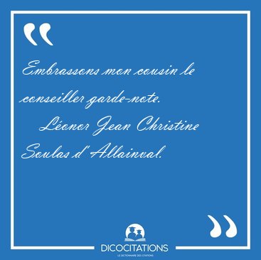 ![Embrassons mon cousin le conseiller [...] - Léonor Jean Christine Soulas d' Allainval... Embrassons mon cousin le conseiller [...] - Léonor Jean Christine Soulas d' Allainval...](/imagescitations/Embrassons_mon_cousin_le_conseiller_-_Leonor_Jean_Christine_Soulas_d_Allainval-36748.jpg)