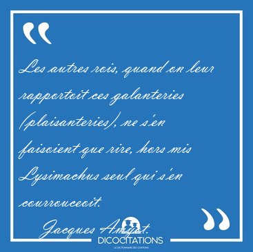 Les autres rois, quand on leur rapportoit ces galanteries (plaisanteries), ne s'en faisoient que rire, hors mis Lysimachus seul qui s'en courrouceoit.