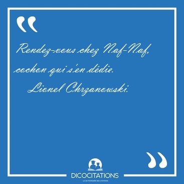 ![Rendez-vous chez Naf-Naf, cochon qui s'en [...] - Lionel Chrzanowski... Rendez-vous chez Naf-Naf, cochon qui s'en [...] - Lionel Chrzanowski...](/imagescitations/Rendez-vous_chez_Naf-Naf_cochon_qui_s_en_-_Lionel_Chrzanowski-41138.jpg)
