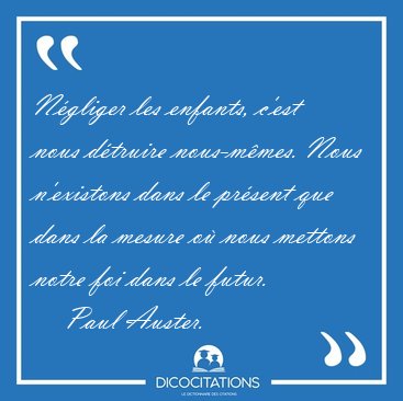 ![Négliger les enfants, c'est nous détruire nous-mêmes. Nous [...] - Paul Auster... Négliger les enfants, c'est nous détruire nous-mêmes. Nous [...] - Paul Auster...](/imagescitations/Negliger_les_enfants_c_est_nous_detruire_nous-memes_Nous_-_Paul_Auster-43827.jpg)