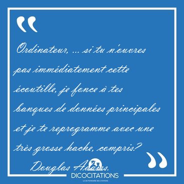 ![Ordinateur, ... si tu n'ouvres pas immédiatement cette [...] - Douglas Adams... Ordinateur, ... si tu n'ouvres pas immédiatement cette [...] - Douglas Adams...](/imagescitations/Ordinateur_si_tu_n_ouvres_pas_immediatement_cette_-_Douglas_Adams-48860.jpg)