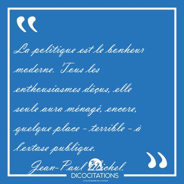 ![La politique est le bonheur moderne. Tous les enthousiasmes [...] - Jean-Paul Michel... La politique est le bonheur moderne. Tous les enthousiasmes [...] - Jean-Paul Michel...](/imagescitations/La_politique_est_le_bonheur_moderne_Tous_les_enthousiasmes_-_Jean-Paul_Michel-53170.jpg)