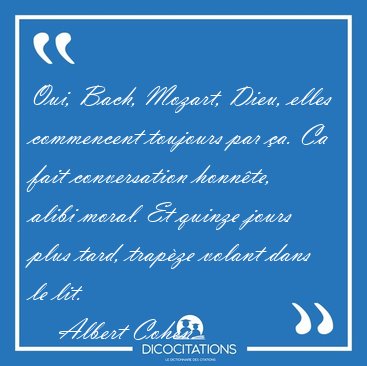 ![Oui, Bach, Mozart, Dieu, elles commencent toujours par ça. Ca [...] - Albert Cohen... Oui, Bach, Mozart, Dieu, elles commencent toujours par ça. Ca [...] - Albert Cohen...](/imagescitations/Oui_Bach_Mozart_Dieu_elles_commencent_toujours_par_ca_Ca_-_Albert_Cohen-54165.jpg)