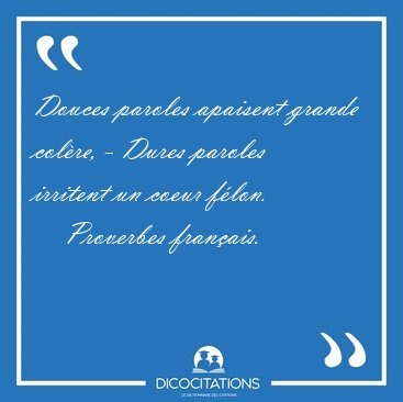 ![Douces paroles apaisent grande colère, - Dures paroles irritent [...] - Proverbes français... Douces paroles apaisent grande colère, - Dures paroles irritent [...] - Proverbes français...](/imagescitations/Douces_paroles_apaisent_grande_colere_-_Dures_paroles_irritent_-_Proverbes_francais-56028.jpg)