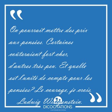 ![On pourrait mettre des prix aux pensées. Certaines coûteraient [...] - Ludwig Wittgenstein... On pourrait mettre des prix aux pensées. Certaines coûteraient [...] - Ludwig Wittgenstein...](/imagescitations/On_pourrait_mettre_des_prix_aux_pensees_Certaines_couteraient_-_Ludwig_Wittgenstein-61389.jpg)