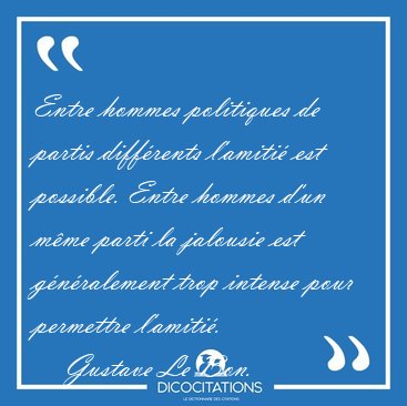 ![Entre hommes politiques de partis différents l'amitié est [...] - Gustave Le Bon... Entre hommes politiques de partis différents l'amitié est [...] - Gustave Le Bon...](/imagescitations/Entre_hommes_politiques_de_partis_differents_l_amitie_est_-_Gustave_Le_Bon-66589.jpg)