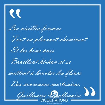 ![Les vieilles femmes Tout en pleurant cheminent Et les bons [...] - Guillaume Apollinaire... Les vieilles femmes Tout en pleurant cheminent Et les bons [...] - Guillaume Apollinaire...](/imagescitations/Les_vieilles_femmes_Tout_en_pleurant_cheminent_Et_les_bons_-_Guillaume_Apollinaire-69410.jpg)
