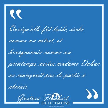 ![Quoiqu'elle fût laide, sèche comme un cotret, et bourgeonnée [...] - Gustave Flaubert... Quoiqu'elle fût laide, sèche comme un cotret, et bourgeonnée [...] - Gustave Flaubert...](/imagescitations/Quoiqu_elle_fut_laide_seche_comme_un_cotret_et_bourgeonnee_-_Gustave_Flaubert-72483.jpg)