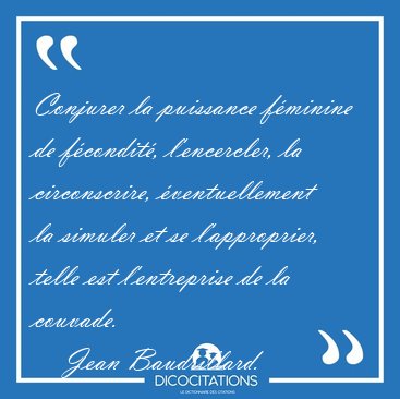 ![Conjurer la puissance féminine de fécondité, l'encercler, la [...] - Jean Baudrillard... Conjurer la puissance féminine de fécondité, l'encercler, la [...] - Jean Baudrillard...](/imagescitations/Conjurer_la_puissance_feminine_de_fecondite_l_encercler_la_-_Jean_Baudrillard-72671.jpg)