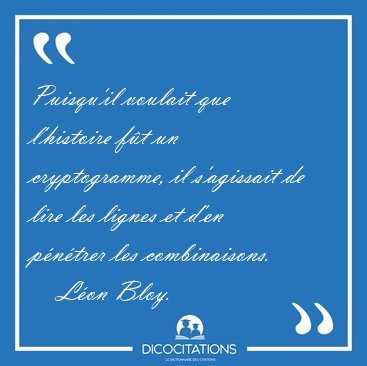 ![Puisqu'il voulait que l'histoire fût un cryptogramme, il [...] - Léon Bloy... Puisqu'il voulait que l'histoire fût un cryptogramme, il [...] - Léon Bloy...](/imagescitations/Puisqu_il_voulait_que_l_histoire_fut_un_cryptogramme_il_-_Leon_Bloy-72909.jpg)