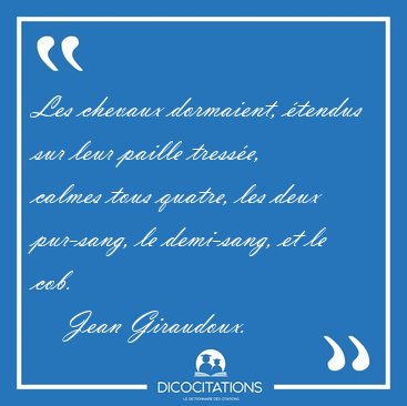 ![Les chevaux dormaient, étendus sur leur paille tressée, calmes [...] - Jean Giraudoux... Les chevaux dormaient, étendus sur leur paille tressée, calmes [...] - Jean Giraudoux...](/imagescitations/Les_chevaux_dormaient_etendus_sur_leur_paille_tressee_calmes_-_Jean_Giraudoux-73799.jpg)