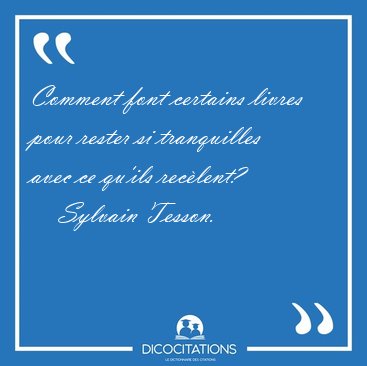![Comment font certains livres pour rester si tranquilles avec ce [...] - Sylvain Tesson... Comment font certains livres pour rester si tranquilles avec ce [...] - Sylvain Tesson...](/imagescitations/Comment_font_certains_livres_pour_rester_si_tranquilles_avec_ce_-_Sylvain_Tesson-75020.jpg)
