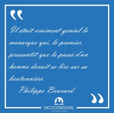 ![Il était vraiment génial le monarque qui, le premier, pressentit [...] - Philippe Bouvard... Il était vraiment génial le monarque qui, le premier, pressentit [...] - Philippe Bouvard...](/imagescitations/Il_etait_vraiment_genial_le_monarque_qui_le_premier_pressentit_-_Philippe_Bouvard-75852.jpg)