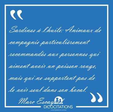 ![Sardines à l'huile: Animaux de compagnie particulièrement [...] - Marc Escayrol... Sardines à l'huile: Animaux de compagnie particulièrement [...] - Marc Escayrol...](/imagescitations/Sardines_a_l_huile_Animaux_de_compagnie_particulierement_-_Marc_Escayrol-76250.jpg)