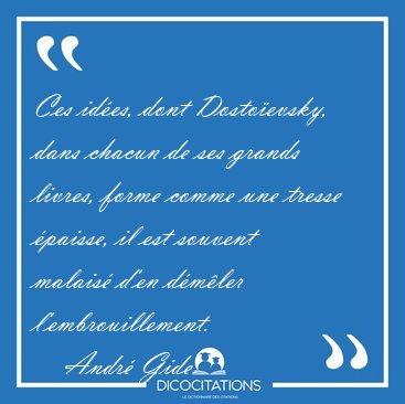 Ces idées, dont Dostoïevsky, dans chacun de ses grands livres, forme comme une tresse épaisse, il est souvent malaisé d'en démêler l'embrouillement.