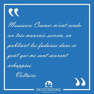 ![Messieurs Cramer m'ont rendu un très mauvais service, en [...] - Voltaire... Messieurs Cramer m'ont rendu un très mauvais service, en [...] - Voltaire...](/imagescitations/Messieurs_Cramer_m_ont_rendu_un_tres_mauvais_service_en_-_Voltaire-83648.jpg)