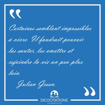 ![Certaines semblent impossibles à vivre. Il faudrait pouvoir les [...] - Julien Green... Certaines semblent impossibles à vivre. Il faudrait pouvoir les [...] - Julien Green...](/imagescitations/Certaines_semblent_impossibles_a_vivre_Il_faudrait_pouvoir_les_-_Julien_Green-86126.jpg)