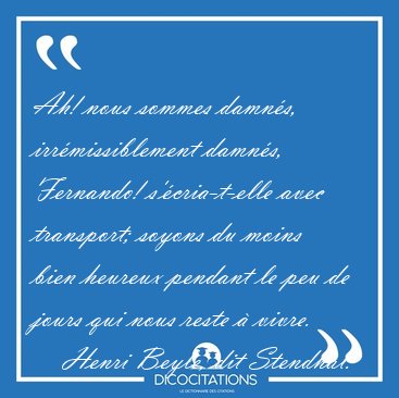 ![Ah! nous sommes damnés, irrémissiblement damnés, Fernando! [...] - Henri Beyle, dit Stendhal... Ah! nous sommes damnés, irrémissiblement damnés, Fernando! [...] - Henri Beyle, dit Stendhal...](/imagescitations/Ah_nous_sommes_damnes_irremissiblement_damnes_Fernando_-_Henri_Beyle_dit_Stendhal-87582.jpg)