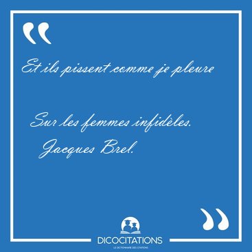 ![Et ils pissent comme je pleure Sur les femmes [...] - Jacques Brel... Et ils pissent comme je pleure Sur les femmes [...] - Jacques Brel...](/imagescitations/Et_ils_pissent_comme_je_pleure_Sur_les_femmes_-_Jacques_Brel-88850.jpg)