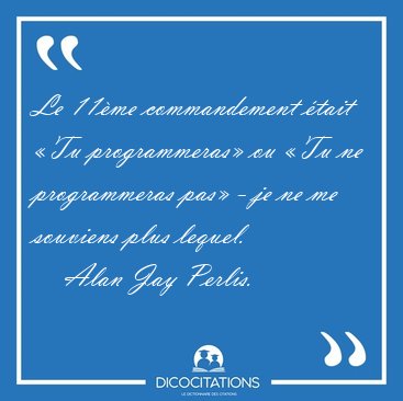 ![Le 11ème commandement était «Tu programmeras» ou «Tu ne [...] - Alan Jay Perlis... Le 11ème commandement était «Tu programmeras» ou «Tu ne [...] - Alan Jay Perlis...](/imagescitations/Le_11eme_commandement_etait_Tu_programmeras_ou_Tu_ne_-_Alan_Jay_Perlis-92465.jpg)