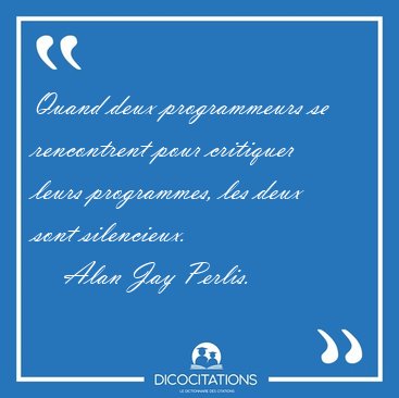 ![Quand deux programmeurs se rencontrent pour critiquer leurs [...] - Alan Jay Perlis... Quand deux programmeurs se rencontrent pour critiquer leurs [...] - Alan Jay Perlis...](/imagescitations/Quand_deux_programmeurs_se_rencontrent_pour_critiquer_leurs_-_Alan_Jay_Perlis-92479.jpg)