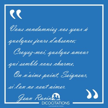 ![Vous condamniez vos yeux à quelques jours d'absence; [...] - Jean Racine... Vous condamniez vos yeux à quelques jours d'absence; [...] - Jean Racine...](/imagescitations/Vous_condamniez_vos_yeux_a_quelques_jours_d_absence_-_Jean_Racine-92622.jpg)
