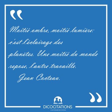 ![Moitié ombre, moitié lumière: c'est l'éclairage des planètes. [...] - Jean Cocteau... Moitié ombre, moitié lumière: c'est l'éclairage des planètes. [...] - Jean Cocteau...](/imagescitations/Moitie_ombre_moitie_lumiere_c_est_l_eclairage_des_planetes_-_Jean_Cocteau-93781.jpg)