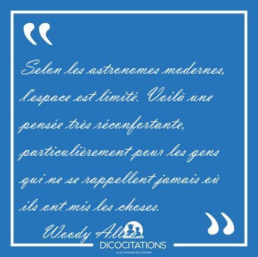 ![Selon les astronomes modernes, l'espace est limité. Voilà une [...] - Woody Allen... Selon les astronomes modernes, l'espace est limité. Voilà une [...] - Woody Allen...](/imagescitations/Selon_les_astronomes_modernes_l_espace_est_limite_Voila_une_-_Woody_Allen-94267.jpg)