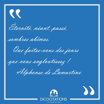 ![Éternité, néant, passé, sombres abîmes, Que faites-vous des [...] - Alphonse de Lamartine... Éternité, néant, passé, sombres abîmes, Que faites-vous des [...] - Alphonse de Lamartine...](/imagescitations/Eternite_neant_passe_sombres_abimes_Que_faites-vous_des_-_Alphonse_de_Lamartine-96402.jpg)