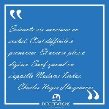 ![Soixante-six saucisses en sachet. C'est difficile à prononcer. [...] - Charles Roger Hargreaves... Soixante-six saucisses en sachet. C'est difficile à prononcer. [...] - Charles Roger Hargreaves...](/imagescitations/Soixante-six_saucisses_en_sachet_C_est_difficile_a_prononcer_-_Charles_Roger_Hargreaves-97071.jpg)