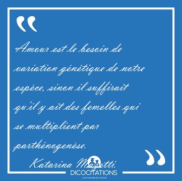![Amour est le besoin de variation génétique de notre espèce, [...] - Katarina Mazetti... Amour est le besoin de variation génétique de notre espèce, [...] - Katarina Mazetti...](/imagescitations/Amour_est_le_besoin_de_variation_genetique_de_notre_espece_-_Katarina_Mazetti-98981.jpg)