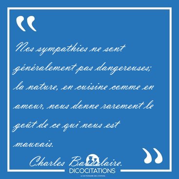 ![Nos sympathies ne sont généralement pas dangereuses; la nature, [...] - Charles Baudelaire... Nos sympathies ne sont généralement pas dangereuses; la nature, [...] - Charles Baudelaire...](/imagescitations/Nos_sympathies_ne_sont_generalement_pas_dangereuses_la_nature_-_Charles_Baudelaire-99814.jpg)